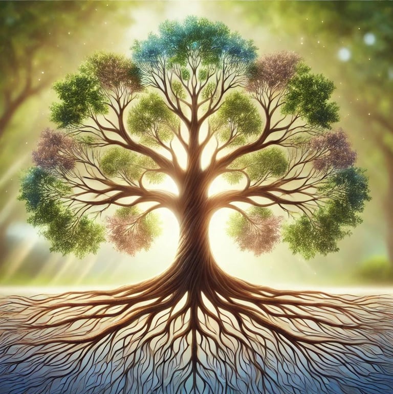 Sun and Light Rays: A radiant sun shines above, with light rays touching all parts of the tree, symbolizing enlightenment, hope, and the nurturing role of the education system.